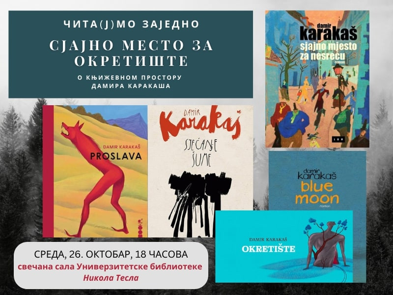 Prva tema u ciklusu nosi naziv “Sjajno mjesto za okretište: književni prostor Damira Karakaša”, a razgovor je zakazan za sredu, 26. oktobra 2022. godine sa početkom u 18 sati. Ulaz je besplatan.