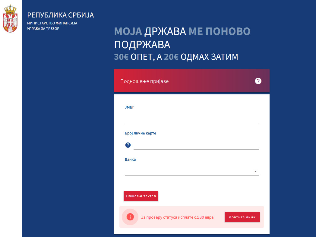 Ostali punoletni državljani Srbije sa prebivalištem na njenoj teritoriji i važećom ličnom kartom, koji se prethodno nisu prijavili, a žele da dobiju dopunsku novčanu pomoć u iznosu od 20 evra u dinarskoj protivvrednosti, kao i oni koji su u međuvremenu stekli pravo na pomoć, bilo da su postali punoletni ili dobili državljanstvo, prebivalište i ličnu kartu, mogu da se prijave na portalu Uprave za trezor u periodu od 15. do 30. novembra.