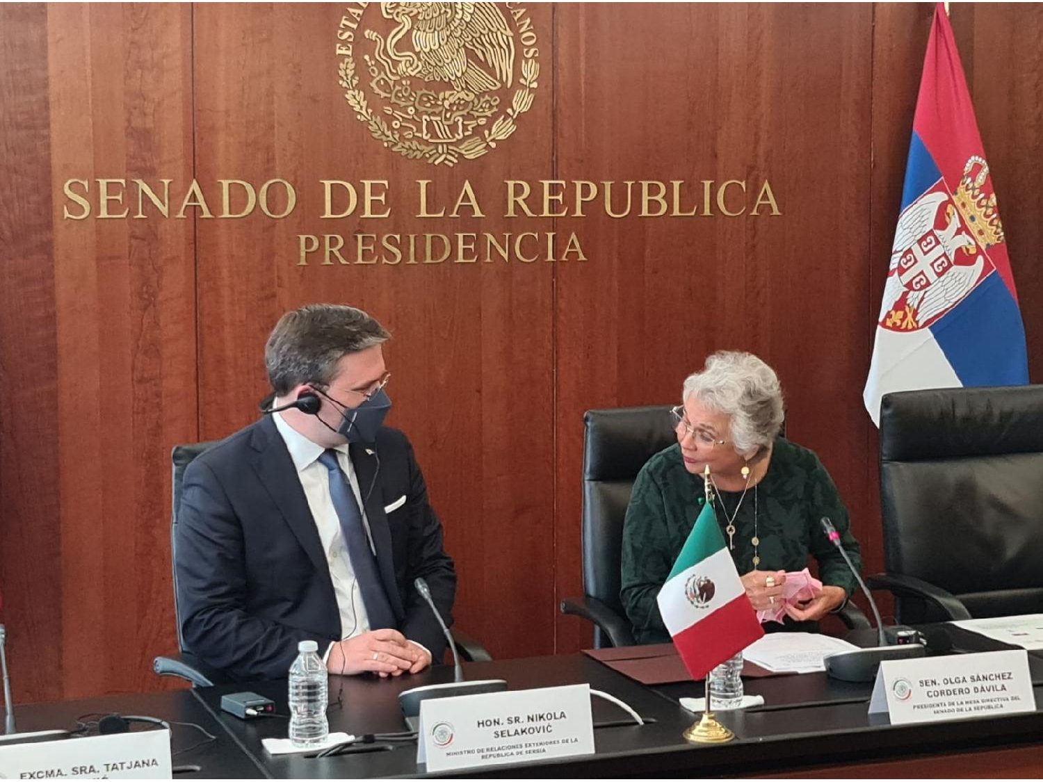 Kako je saopštilo Ministarstvo spoljnih poslova, Selaković je sinoć u razgovoru predsednici meksičkog Senata Olgi Sanćez Kordero zahvalio na njenom ličnom doprinosu izgradnji odnosa Meksika i Srbije i na nedavnoj ratifikaciji Sporazuma o prosvetnoj, kulturnoj i sportskoj saradnji, izrazivši uverenje da će ta činjenica doprineti jačanju veza na ovim poljima.
