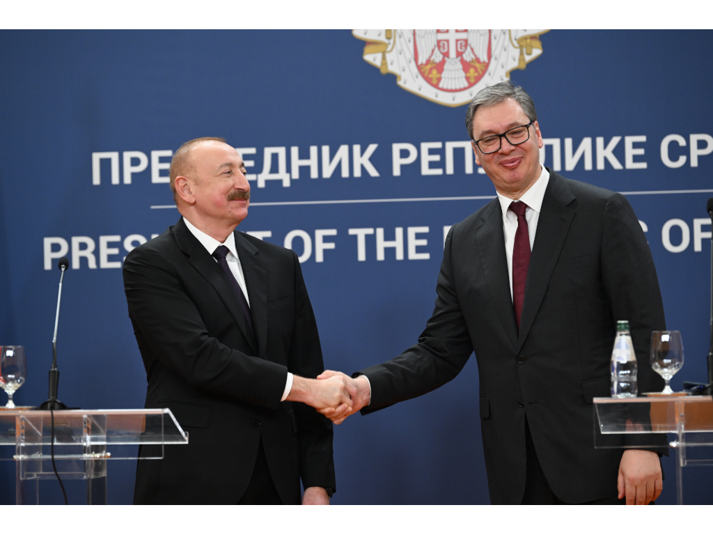 "Pa se nadam da bez obzira na lošije vremenske uslove to tumačimo na najbolji način i razumemo koliko je svetla budućnost ispred Srbije i Azerbejdžana, makar što se tiče naših bilateralnih odnosa. Želim da iskažem veliko poštovanje prema narodu Azerbejdžana, prema vama lično, poštovani gospodine predsedniče, i hoću i pred ljudima u Srbiji da kažem, naravno i pred ljudima iz Azerbejdžana, da svaki put u razgovorima sa vama mnogo toga naučim", rekao je Vučić u Palati Srbija.