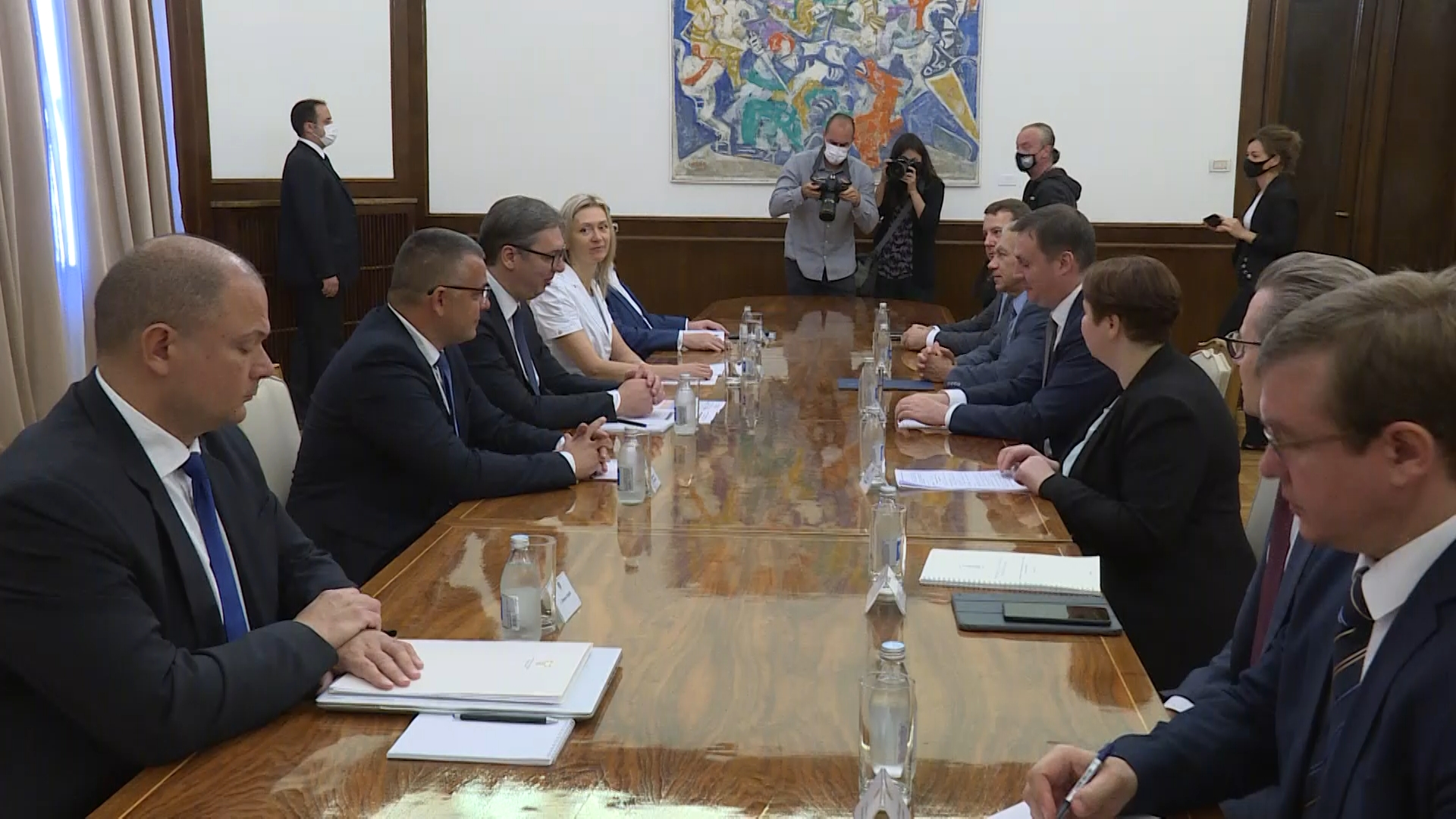 Predsednik Vučić i ministar Patrušev su konstatovali da bi osnivanje zajedničkih kompanija u cilju nastupa na trećim tržištima donelo izuzetno veliku korist za obe strane, budući da Srbija i Ruska Federacija imaju vrhunske proizvode kojima bi mogle da pokriju dobar deo potražnje na globalnom tržištu.